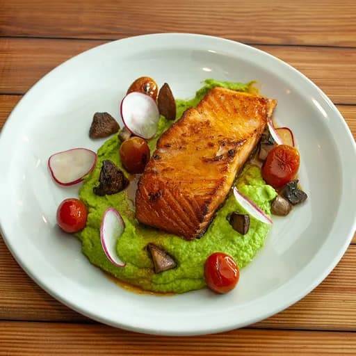 Salmón rosado fresco 250 gr con cremoso de arvejas, hongos, cherrys, vegetales asados en oliva, salsa de maracuyá.