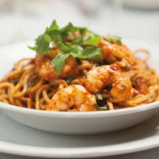 Spaghetti con langostinos, tomates secos, rúcula, tomate